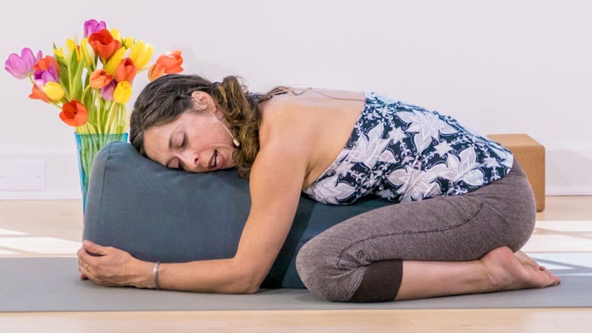 Let's see if we can go back to use the technique of lengthening your exhale and take a little pause at the end of exhale. Just a few more breaths here, in this way, in our Supported Bridge. You could use pillows underneath your back, you could use a bolster underneath your back. And as we come up, we'll lift the body up, and slide the bolster out of your way, so you can have a flat, neutral spine for a moment, then when you're ready, we'll come up and we'll use that bolster again for a Supported Child's Pose. So we have the knees wide and we're gonna turn the bolster so it's tall, so rather than be on the flat edge, come up a little bit higher and you can maybe imagine in bed, just a few pillows underneath you for support.