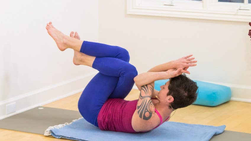 So whatever leg is on top, bring that arm underneath. And we'll start by inhaling. And then exhaling. You can let your legs come down, uncross your ankles. And then again, whatever leg is on top, allow your legs to fall that direction. And bring your breath awareness into the space between your ribs and your hip. And inhale deeply. And then you can come back to the center. Okay, so I had to move my blanket back and my body back a little bit from the wall. You might need to as well. The next movement that we're going to do has a similarity to canoe, to the pose that we started with. So you can start with your knees bent and your feet down. On an exhale breath, bring your chin towards your throat. And here you want to lift your shoulder blades all the way off of the floor. From here, take both of your feet up towards the ceiling and bring your arms forwards. On an exhale breath, drop your legs so that your feet are in line with your forehead. Take an inhale. And then with your exhale, roll your pelvis to one side and try and keep your chest facing straight up towards the ceiling. Inhale, come back to the center. And exhale to the other side. Now back to the center. So we'll do five each way. Inhale. So as you're moving, you want to keep your chest straight up. Or as straight as you can. Shoulders off the ground. And that's a twist. You're thinking about taking one half of your pelvis over the other. And when you're done with five, go ahead and bring your knees back to your chest and let your head rest down. So between all of these movements, just give yourself a couple of breaths or whatever you need if you want to do a little bit of a bridge or another type of stretch between them. Right? So the next movement that we'll do requires some awareness through your midsection in order to not go into a back bend. We'll bring our legs up at 90 degrees. And pretty much as soon as you bring your legs up, you might feel that your pelvis wants to tilt almost like you're wagging your tail back. And where you want to be here is not in a big tilt, but it's also not in a strong tuck. So you'd like to find a place that's kind of called the neutral spine or what's in the middle of either extreme range of movement. And what you might do is just experiment with some pelvic tilts on your own and notice when you take your tail back, the back bend shape that you get in your lower back, or when you tuck your tail towards your heels that your back flattens against the floor. And find some place that feels fairly easeful in the middle. Now that ease isn't going to unfortunately probably won't be something that you feel when your legs are lifted up. But you'll think about the three dimensions of your torso wrapping in towards the center of your body. And when you lift your legs up, you'll keep that three dimensional wrapping and then also think about lengthening through the center of your body. So I find that for myself, if I keep my head and upper body engaged in this, it's easier than just firming around my torso. Then bring your arms up and let the weight of your arms rest back towards your shoulders. Option one from here is to just take one leg down at a time and tap your toes to the floor. Now notice that here I'm moving from my hips and the bend in my knees is pretty much staying the same. Option two is both legs at once. So let's do maybe another five and if you're doing one leg at a time, go ahead. And then if you're doing both legs, go ahead. And I'm going to do a couple with both legs. So again, I'm still reaching through my head, feeling all sides of my torso hug around and support me. All right. So then we'll pause with the legs just at 90 degrees. And from here, you'll just use your arms. Now one thing is you want to keep your arm bones resting back, so upper arm bones resting in the shoulder joint. Try not to lift your shoulders too far back away from the floor, but think about the weight of your arms resting back and then from here, bring your arms back and tap the ground. And we'll do five here. So it's up to you if you want to repeat doing one set, either your legs and your arms one at a time, or if you want to give both a try at once. And we'll do five. And when you're finished with five, go ahead and bring your knees in towards your chest and the soles of your feet together. So your knees come out. Take your hands and wrap them around your ankles or your shins. If it's possible, you can bring them around the little toe sides of your feet. And then let the weight of your thighs rest down towards the floor. Let your knees relax out. Take a couple of deep breaths all the way down into the lowest part of your belly. So again, for me, it's important that after doing strengthening work, there's also some more relaxing work that's done. And especially when we're working in the abdominals, this isn't a place in your body where you want to live with a lot of hardness or tension all the time. So ideally you do strengthening so that it's supporting to you in your activities. But then you can also relax this part of your body too, especially if you're eating or laughing, enjoying your life. All right. So from here, bring one ankle to cross over the other. And now take your arms outside of your knees and reach around and grab ahold of the little toe sides of your feet. So you'll hug the soles of your feet towards the backs of your thighs. And for me, this provides just a nice release for my lower back and belly. And again, I'm letting my belly relax as much as I can while I inhale. And then switch which ankle is on top. All right. So from here, we'll, um, roll onto our bellies and do some strengthening for the lower back. And you'll come into sphinx pose. So in sphinx pose, I want my elbows below my shoulders and arms bent at about 90 degrees. Now, if this is causing pain or tension for you in your low back, you can bring your elbows further forwards and that's fine. One thing to think about either way, and e