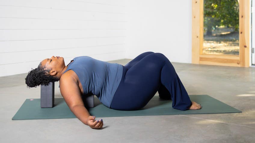 We're going to begin in one of my favorite shapes is probably yours too reclining butterfly. And the way that I'm going to set this reclining butterfly up is, on purpose. I'm going to use the high block under my head. So the block has three levels And then a medium level block underneath my back tracing my shoulders. A lot of people will also bring the block tracing the spine. But what I wanna do is actually stabilize my neck and give some shoulder relief. So supporting the shoulders in this way works really well. If you have a different way of doing it that you prefer, you're welcome to do that as well.