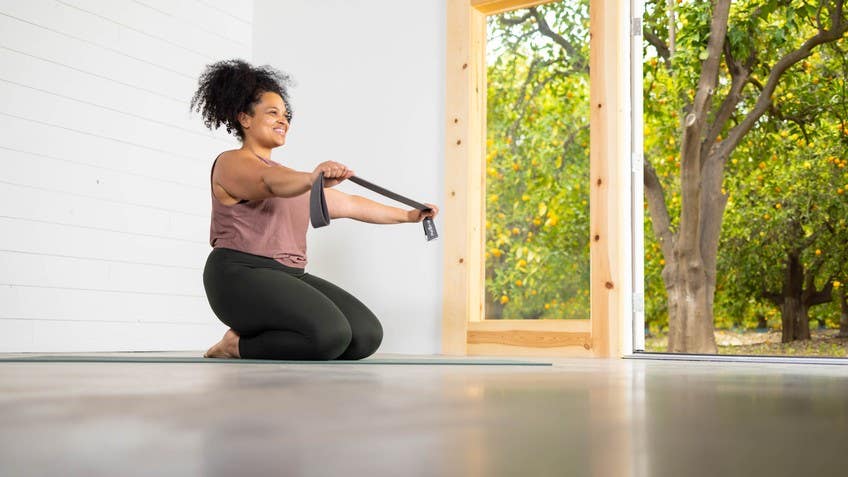 Just continuing to get unstuck through the shoulders, through the chest. And lubricating now the shoulder joint. Only a 100 more of these should do. Or one, whichever we get to first. Set your strap to the side.