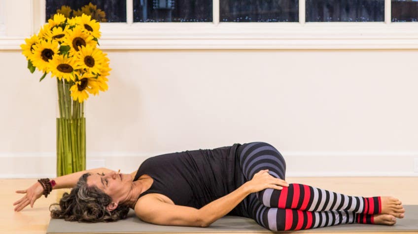 Any feeling of tingling or sensation down in that lower left side. In the back, in the thigh. You know these practices are in relationship and so we're starting to study the effect and find out if they're useful. Okay really nice. Now you're gonna roll onto your left side again for what we call reclining Buddha, and we're moving into a shoulder stretch.