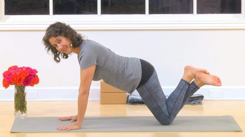 Come onto all fours. Spread the fingers super wide. Now let your elbows bend, shoulders relax back and down and then root and lengthen. Maintain some integrity here. Squeeze the arms a little bit, and then let your knees stay and lift up through the ankles.
