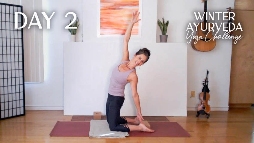 Hello everyone. Welcome to day two of the Ayurveda Winter Challenge. Excited to have you here with me today. Hope you're feeling some new muscles from yesterday. Hopefully you don't feel too sore. And if so, we're going to loosen up those areas and then connect you to more core muscles today. That's kind of our big theme. We'll do some floor work to begin with and gradually work up towards some kneeling work that strengthens the back and abdominal area. Then do our sun salutations, which are going to be part of the active classes this week. So we can check that off our to-do list to increase circulation and warmth. And then of course we'll do some standing poses for some strength and concentration before we work our way back down and do some sitting poses to start to enjoy the more reflective aspect of the class. And then of course a little short Shavasana at the end today. So for class, it'll be helpful to have two blocks and a blanket. And we're going to actually start on our back with the two blocks. So if you sat one of them at a medium position and then one of them flat and wide, so it kind of looks like a T shape with your blocks. And then what I'll typically do is sit down in front of the blocks. And then as I recline back, I put my elbows down, slide one block basically up between my shoulder blade area and then lean onto that flat block. Make sure it's in the right spot. And then take the second block, that taller block underneath your head. So it basically catches the occipital ridge, the base of your skull. And we want the chin to be parallel to the floor rather than pointing to the ceiling. And then let your arms come down perhaps to your side as a starting position. And that will typically be the easiest in your shoulders. Legs, bed might be a nice way to start the practice. And then consider some different variations that might include stretching your legs straight down to the floor, kind of to the edges of your mat. Or maybe your arms slide higher up towards the direction of your ears. So it might look from the ceiling view if you're looking down at yourself like you're making an X shape. You're welcome to make up some other variations. Sometimes people like bottoms of the feet together, legs open wide for hip opening. So we've got hip opening, we've got legs down straight or legs stay bent. I'll keep the X position myself. And once you've decided on what your legs are going to do and the angle that your arms might stay at, then perhaps we start to formally commit a little bit now to practice. It's consciously separating from whatever it is you've been doing today to enter this time to be a little bit more reflective, a little bit more aware of how your body is moment by moment. So we can start with just basic awareness of where you feel support. And might you surrender a little bit more of the weight of your body into the places you feel support. Back of the head, hands, arms. Might we surrender a little bit more of our weights into the blocks, the one under your ribs? Might we relax a little bit more, surrender a little bit more of the buttocks, the weight of the legs? And once we feel a little bit more supported by your environments, the ground, the props, see if you can start to notice the slight ripple of movements that's occurred as you're breathing in from your nose, down through your chest, down into your upper belly. Eventually that little ripple of movement down into the mid belly or low belly. And then feeling that wind of breath move up from the naval area all the way back up towards your nose. And at the end of that exhale, perhaps we savor that pause, that dormant phase before we nourish again with another inhale. And brighten up a little bit through the upper chest, maybe even the mind feels a little brighter after a long inhale, short pause. And then find that pause at the end of your exhale. It pulls you a little bit deeper in, that reflective state. And then see if those fuller inhales again help bring more energy through the upper chest and also help to awaken or brighten the mind. Over your next moment or two, please change your leg position so that maybe we all come together with the legs straight down on the floor as if you were in tadasana legs. If I can have you bring your fingertips to the upper corners of your chest so you can float your elbows off the floor. And now like little bird wings, let's bring our elbows down towards the side of your waist, like you're flapping your wings down and then slide those elbows, your wings up towards your ear direction and then down and then up. So I'm showing that bent arm version in case there's any shoulder injuries, you might stay there or we drop the arms down and create snow angel arms and sweep the arms towards your ears and then all the way down to your side. Snow angel arms, the arms are floating in space as they go back and as they come down towards your side. If your shoulders are open enough, you might be sweeping your hands along the floor as you're going back and forth. Be mindful how your body feels as you're taking these bigger stretches. Be mindful of any injuries in the shoulder area. Alright, now next time your arms are back by your ears, raise your arms straight up in the air above your chest and lace your fingers together and bring your right knee towards your chest and now grab that right knee and squeeze your knee a little bit towards your chest and we're paying attention to how we're balancing our head and back on the blocks. Please keep your fingers lace, let the right leg go back to the floor as your arms stretch back towards your ears. We're in a big full body stretch and bring your left knee towards your chest, grab that knee, give it a hug towards your belly, mindful of balancing on your blocks. Go a little bit faster now, left leg down, arms by your ears and then bring right knee in, give it a squeeze. Arms go back, right leg down, then tip the left knee in, give that a squeeze towa