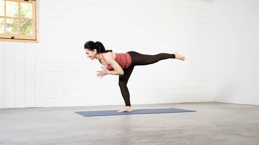 Exhale hinge. Stay here and then sweep your left leg back warrior 3. Round your back, pull your front ribs up remember the bolster. Take the arms forward step back warrior. 1, breathe in, and then both hands to the mat Stepping back, down dog, and breathe out.