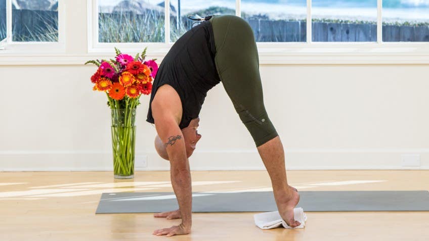 Inhale, pressing up, gazing forward and exhale. Pressing up, resetting your lunge, stepping back into plank, chaturanga half or full, rising up dog or cobra and drawing it back into down dog. Excuse me. Breathing here, taking a moment, hands pressed down and now let your feet come in about an inch or two. Let the heels come together, bend your knees and sit back onto the heels, arms extend forward in this variation malasana, looking out. So using hasta bandha, the hands pressed down and then spring up, pull the heels in and softly land back. Press down, pull up, softly land, learning to float, learning to engage the core, press and reset. Coming into down dog, take a big inhale, open the mouth. Now using that same action, floating or step the feet forward, so spring up and fold. Inhale, rising and exhale, hands to the heart. Let's pause a moment, feel that fire rising, awakening within. So coming into our namaskar, inhale, lift up, exhale as you fall. Inhale, halfway now, floating or stepping back, rising up dog or cobra and drawing it back into down dog. Feet together, right leg inhale, let it rise. Exhale, stepping through, back heel ground zero one, sweep out, lift up and then heaven to earth, coming back down, stepping into plank, chaturanga, let it rise up dog or cobra and drawing back into down dog. Feet together, left leg inhale, let it rise, one breath, one movement. Now exhale as you step, exhale rise up, exhale down. Feel the in breath, take your time, plank, chaturanga, exhale, inhale and exhale back, pause a moment. So we're going to take two more, just like this, coming together, here is one, so feet together, right leg, inhale to the sky, exhale as you step, inhale rise, exhale down, stepping back, your vinyasa, heart will rise and drawing back. Feet together, left leg inhale, exhale, zero one, sweep out, rise, so feel the prana vayu and then apana, step it back, your vinyasa, rising and back, down dog, excuse me, one more cycle, feet together, right leg inhale, exhale starting to feel the heat awakening that fire lifting, exhale moving into the flow, exhale, inhale and exhaling, feet together, left leg inhale to the sky, exhale as you step, inhale rising and exhale, feel the in breath stepping into plank, take your time and chaturanga, rising up dog or cobra and drawing back into down dog, take a moment pause, we're going to feel those fireballs of jumping once again, so feet come in just a little, heels together, knees play out, sit back, gaze forward, really active, spread the fingers wide and as you spring up, pull in, softly land, gaze forward, pull in and softly land, so you get a little hang time each time, gaze forward, spring up and reset, coming into your down dog, take a moment, come down to the knees and coming down into child's pose, pause, inhale, take a big inhale and exhale, so walk the hands back, rolling the body up, so I forgot to mention at the beginning of this practice, if you have a towel, we're going to be using a towel, if you need a blanket or anything that you can use, coming on to the floor, so I'm going to place the towel here off to the side of the mat and we'll be using it to really finding that lift that takes us into handstand, will take us up into arm balances, different places that we really need to engage at the core, lower part of the belly, so as we come together here, you're going to feel this activation at the center, the fire rising, yay, so again this being a fire practice, don't be afraid to get into the core, get into the fire, third chakra, so placing the towel, it's nice if you have a wood floor, if you have the carpet, you could also do this on the carpeting, not a big deal but we want to protect the tops of the feet, towel right alongside at the back, coming, putting your tops of the feet on to the towel, because we're going to slide, walking the hands out and then lifting the knees coming into this up dog, and so pressing down through hasta banda, really engaging, press down, pull the hips up and then press back, yeah, so we're going to do this four more times, right, so press down, lift and press back, press up and press back, yeah, press up and back and then press up, lift, lift, lift and back, ah, and then pressing back and just pause into child's pose, yeah, rolling the body up, so you can take your towel and press it off to the side, it's also there in case we start to sweat a little right, leaving it there, so coming seated, take hold back to the thighs, right, and we can't be talking about the fire without doing a little fire or core work, right, so one way of getting through core work, it's probably the only way of getting through core work, is smiling, right, because if you don't like it, you're going to never like it, so you might as well enjoy it, you're here, you've chosen to be here, let's be here, so lift up, press the heels away and then coming down, ardenavasana, ah, taking the hands to the back of the head, now the same action, we just felt it there, right, pull the right knee in and then reach forward, oh yeah, change the legs and then reach, big smile, or stick out your tongue at me, legs come out, hands extend, now use that same action, we just felt it, right, rise up, oh, navasana, yeah, alright, a few more cycles, right, so ardenavasana coming down, hands to the head, neck is long, right knee pulls in and then reach, oh yes, change the legs and then reach, yeah, and then extend from the navel, rise up, oh yes, I know you got one more in you, right, hold the backs of the thighs, lift the heart, as we're ready, feet are active, arms out and lower down, hover, hover, right, hands to the head, right knee in, reach, oh yeah, it feels good, some of you are like, no it doesn't, well imagine it feels good, left knee in and reach and extend, rise up, alright, almost there, gonna come down, ardenavasana, pause, pause, let yourself like tremble, right, it's like shaking, you're like, oh stop, stop, stop, we're not 