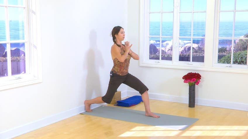 So, we might not lunge as deep as you usually do, but I'd like you to feel like we're starting to work your right foot just as much as your left foot. Left hand on the knee, just start to ease into the lunge and so if there's any tendency to shift your shoulders to the left, we can keep shifting the shoulders more to the right and then see what happens in the legs when you're actively using your back leg as much as this front leg. So, it should feel really even through the legs, easy through the spine as we stretch up. You might even take the opposite arm up with a flexed wrist and just take a moment to sit deeper into your shape while activating that right foot, maybe more than you're used to. One more breath here.