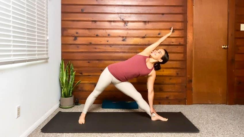 And inhale, press through the ball, the right foot. Arms reach. Exhale, warrior two. Let's take three more rounds with the breath. Inhale, pressing, lifting and lengthening. Exhale, bending, opening and rooting. Maybe there's one more warrior two dance. Eventually pausing in the shape of warrior two. Move into reverse. Slide the left hand down the back leg. Inhale, right arm reaches. And then exhale, side angle. Right form onto the right thigh. Sweeping the left arm over the ear. Returning the rib cage. Breathing. Strong through the legs. Inhale, back into your warrior two. We'll reverse again and then press through the ball of that right foot. Straighten the right leg. You might toe heel your back foot in for triangle pose. Inhale to lengthen. Exhale, begin to reach. And then right hand might find the shin, the ankle or a block as you reach your left arm up towards the sky. Any variation here in your triangle pose with that top arm. Today I'm going to find that internal rotation. Then the elbow. You might bring the back of the hand to your sacrum where you might experiment with wrapping that hand around the thigh bone. Maybe softening the right ear towards the right shoulder. Nodding the head gently. And breathing. When you feel ready, free that top arm up to the sky. Release it down. Coming into our pyramid pose. Long pyramid. Spin onto the ball of your back left foot.