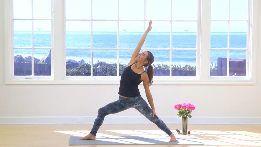 Sink down into the hips, dropping to the sip bones, and breathing into the shape. (breathing) And some morning, I like to keep my hands grounded towards the floor. Some morning, the palms up, lifting the heart. And then from here, finding reverse warrior sliding the back hand down the leg, lift the top arm up. And then, as you're ready, press into the ball of the foot, Trikonasana triangle pose, lengthening.