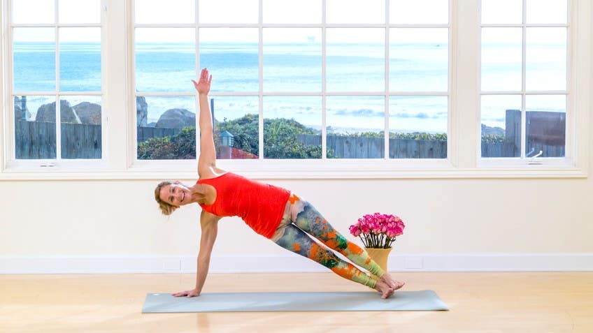 And notice your right side body, can you find just as much space there as you do on the left? Good, exhale, windmill it down, right hand to the inside of foot, lunge twist. Good, rooting through the right palm, drop the outer edge of the back foot down, last one, bring the knee into the chest, step back, Vashistasana. Exhale, left fingertips down, inhale, draw it back strong, lift the hips up as high as you can. Exhale, fingertips touch.