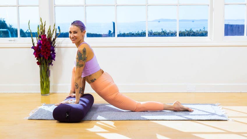 Start to walk your hands back and little by little roll up through your spine take a moment to windshield wiper your legs feet on the ground just moving the knees from side to side so we're gonna head towards our peak pose now our Hanumanasana or splits pose but we can use lots of props to make it doable doesn't have to be scary so I'm gonna bring a bolster around and I'll show you how to use the bolster and you could put a bolster and pile it up with blankets too if you want or blocks or pillows or whatever you've got to put underneath you the right foot is gonna step over the bolster and we've got the support here so that as you start to inch your right foot forward and your left knee back you might come down to rest on the bolster I'm just sending the right foot away lengthening the right leg the left leg back and again you could pile up more things if you need to or you could always stay with the back knee bent and the front leg extended like this in what we sometimes called Arda Hanumanasana half splits and I'll show you without a bolster what it might look like if you don't have one no problem you could stay here with your hips over your back knee and your front leg extended or any amount you're just inching the front leg forward and or the back leg back until you find whatever is your version of the splits where you could stay upright or you could even fold over your front leg in a rounded soft way so it's really helpful to remember now that we're not doing this for us we're not doing this to be cool we're not doing this so we can add it to our our pocket and say yeah I can do a split what would it feel like to do it for somebody else what would it feel like to be totally unselfish here and imagine you're giving this pose to your friend on a silver platter tied with a bow to that person you remembered in the beginning who makes you feel so full of love how do you breathe when your shape is an offering and know that if it starts to get intense you can get out if you need to there's no mandate that you're stuck here for the whole time but also know that you can do hard things that you can feel a little awkward or uncomfortable but there also might be some ease at the same time that we can have respect for this discomfort that we feel and be curious about it Mmm Mmm Come out of this one really carefully. It's a big shape, so go slow. You can start to walk your hands back, and it's a little bit like having to pull yourself back together. You got to kind of call on your low belly muscles to help bring that front leg back. If you had a bolster or pillows, you could push them off to the side, and bringing your right knee back to meet your left knee, a couple of choices.