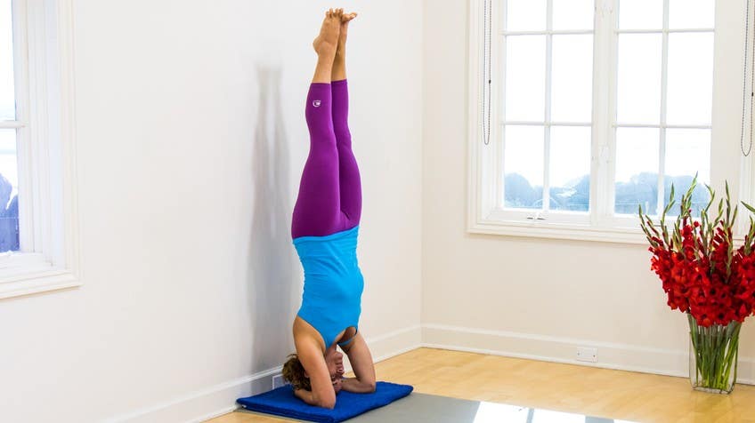 You can start to work with just lightly pressing up off the toes, pulling the navel in and lifting the feet up off the mat. This might be with straight legs or with bent knees. You might take one foot and then the other, but again, try not to kick up. Once you feel your hips aligned over your shoulders, you can take your feet to the wall and slide them up the wall or you can go straight up and start to just find that stability of squeezing the legs together. Keep the legs very active.