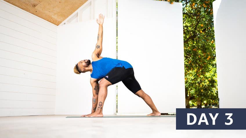 Hey, everyone. Welcome to day three of our 10 day challenge. Alright, for today's sequence, we're going to use a block for like the first section, we're not going to go too crazy with it, but just have this nearby as we begin. And when you're ready, we're going to start on our back. Okay. So as you lay flat down, just join me in bada khanasana, bottoms of the feet together, let the knees open up, and the hands can rest on the body. Alright, your choice, if you want to let both hands kind of rest in the same spot, the belly is a good option. You could also take the hands to the heart. We can do both if that feels a little more just spread out as far as just energy and awareness goes. And just take a moment. See if you can feel the weight of the legs opening up the insides of the hips. And then just let that ground your attention and focus for a moment. So wherever you're coming from, or whatever you've been just dealing with before you tap into the body and practice today, let those sensations of the legs just ground your mind. Alright, take a deep inhale here. Nice, smooth exhale. Do that one more time to get deep in him. And let the exhale just relax the legs a little more down the middle. Alright, from here you're going to slowly draw the knees in. And you just take the feet a little wider onto the mat. Alright, so beginning with the right leg, I want you to just stretch your right leg straight towards the ceiling. And then bend your knee, cross the ankle on top of your left leg and then draw both legs up towards the chest. Right hand, I want you to swing between both legs and at least the fingers on the top of that left leg. So once you've got that grip, soften the head, soften the upper body a little bit more. And then just take all your awareness of that feeling in the right leg. And then feel it for a moment. We're stretching that right leg, but we're going to make this a little more active. So feel that you can press the top leg down and into the bottom leg. And with the bottom leg in your hands, just pull back up like you're trying to resist that effort for a moment. Good. Keep that and then just let that sensation just take up all the space in your mind for a bit. Good. Alright, take a nice inhale to breathe here. Good. And then as you exhale, just slowly bring the legs back down to the mat, unravel, take that right foot down. Okay, let that register. If it feels nice, you can take a little sway through the legs as well. Alright, so in your next breath, stretch your left leg up towards the ceiling. Right and then same thing we did on the other side, you're going to cross your ankle on top of the knee and then draw both legs up towards the chest. Left arm in between the legs and you're going to interlace on top of that right knee one more time. Good. Okay, and then once you got that grip, let everything else just relax around that. Okay. And again, instead of this being like a super passive stretch, engage a bit. So that top leg again is working down into the bottom leg. And then with the bottom leg and hands is as if you don't want that top leg to win, right? Pull up. Right. And again, that little bit of engagement, just let that be at the center of your mind and just keep that focus as you breathe. Nice.