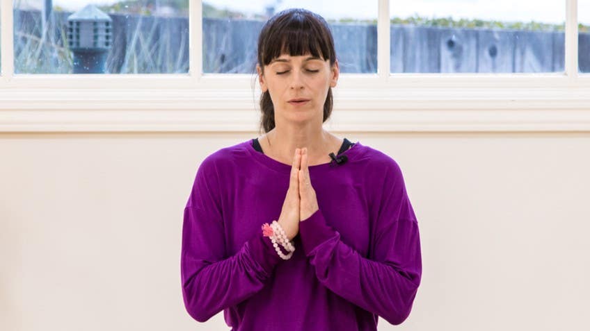 And press your palms together at your heart center, and bow forward, sealing your practice.