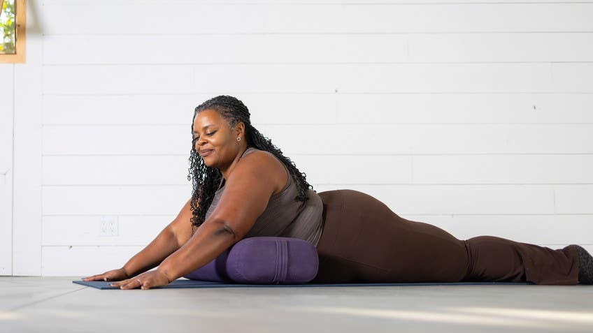 Oh, if this feels too restful, you can always bring the bolster closer in, which will then increase the back bent, or you can scoot up a little bit more. But whatever you choose for yourself, find stillness. If things have gotten less interesting, feel free to press into your hands to come up to seal And you can keep the bolster underneath your chest for that awareness and a little bit of support here. Don't forget that you can always change your mind, come back to sphinx. This is simply an exploration of what your back wants this morning.