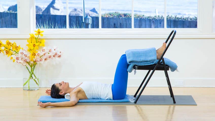 Welcome to the restorative practice, legs up a chair. This is the perfect practice to help you feel more grounded and to slow down, but it's also really great to reduce stress and even anxiety because this shape that we're going to make allows a muscle in our body called the psoas muscle to be in a position where it can release deeply held tension. And why that's important in relationship to stress and anxiety is when we feel threatened, when we don't feel okay, for whatever reason, the moment we start to feel nervous and not at ease, in one-twentieth of a second, the time between two heartbeats, we get this stress response and the very first muscle to get the message that it needs to protect us is the psoas. So repeatedly, every time we feel stressed, we get this taught tense reaction in the psoas that prepares us very wisely to fight or flee. However, when it's getting that message all day long, it becomes chronically short and it pulls on our body into this position almost like a sprinter at a starting line.