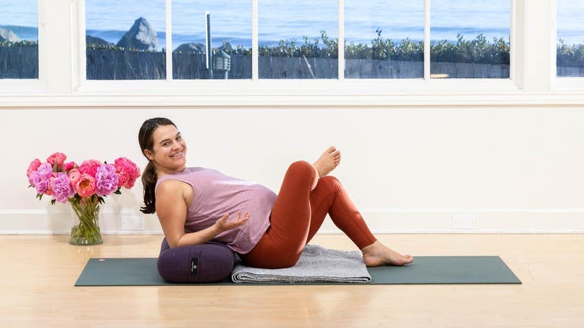 Welcome, so happy to be here with you and our babies. This practice is an invitation to rest within. It'll be a floor practice that'll primarily target the pelvis, the hips, the legs. At the end of our practice, we'll find an inversion bringing our legs up. For now, it'll be nice to have a blanket, a bolster, or a couple pillows, and a block.