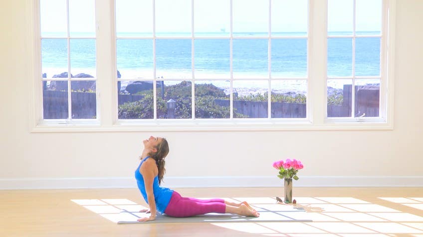 And, exhale, release. Lower down, chaturanga, inhale, upward dog. Exhale, downward dog. And, about three to five breaths here. (breathing deeply) And then, as you're ready, walk or jump forward.