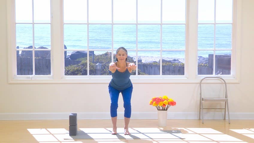 Lengthening the spine forward primarily, rather than coming way over to the side on this, although there's no problem with doing that either. And then inhale up to center, so I'm gonna do a few without the blocks, over to the side, so you can see what that might look like. And inhale up, so use your breath, breathe into your belly, exhale, turn the other foot out, and bend your knee. So you're cultivating a longer breath here. Inhale, exhale. And you're lengthening the back of your neck so that really it's more like the crown is pointing straight ahead. Your eyes are softly down, rather than always having to have the head up, and contracting the back of the neck, and creating tension there. You can release a lot of tension by just looking at the floor. Inhale, back up to center, so that is probably enough times with that. And then, depending on your ability to go down further, you could put your head on a block, and that same thing of keeping the front and back of the neck equally long, and perhaps you would be able to put the very top of your head on the block, and some of you might be able to go to the floor. But you can see I'm only going to the floor because it's not a strain for me. I have had times when I've had an injury or something, and I'm up here. Okay, and many of my students stay high like that too. There's no shame in that, it's just where you are, and that's where the journey begins, is right where you are. So we'll come up now, take a deep breath, you can use the block, and then with your deep breath, you're halfway up on the inhale, and then exhale, come up heel, toe, together until you can step together, and then just pause and feel what that first movement has done for you. So as I said, we're working on getting some of it, some looseness and openness, connectivity into the hips, and that's the first one. Now we're going to move into a little series of squats, and squats also can be useful sometimes to have props, so this can be done at the wall, but it's fine to do it this way. You'll start with a stance that's maybe half as wide as we were doing before, and the feet are going to be turned out, and as you imagine lengthening down the outsides of your legs towards your knees, and back in here, you can let your hips move back, and then you can rest your forearms on your knees, and this could be the position of your squat, but you can also bring your bottom onto the squat, onto the blocks, and just hold it like this. Okay, now I'm having to work a little bit to keep my knees out, and I would sort of like to get a little deeper in the squat. If you can, you can drop down a little bit lower, and lean forward just a little bit, and now your arms can be on the inside of your legs, and there's this nice connection between arms and legs that helps. All the while I'm keeping my back straight, and just sitting here, and of course any woman who's ever had a baby may indeed know how wonderful it is to be able to do this, and it can be done, of course, even lower. You might have to narrow your stance, so just because you have you start with your legs a certain distance apart, it doesn't mean that you have to keep them exactly there. You adjust according to your sensory feedback. So here I am with my feet a little closer than I started, and I'm down in the deeper squat. And then the final piece that I like to do with this one, going a little wider again, is to go a little bit left, a little bit right. You can see I have my elbows, arms into my thighs to help support this. I'm not moving fast, I'm just working back and forth. And the sacrum, the pelvis, and the thighs, they all sort of get hugged in towards each other with this in a way that can help to sort of almost just realign a bit. Okay, so to come up you're gonna just lift your hips and then make your feet parallel again. We're not as wide as we were for the previous standing forward bend, but we're just on our way up. Some of you might like to go deeply down one more time. Even in this deeply down, you don't have to force to try to get yourself down. Just release the shoulders back towards your waist, lengthen down through your sternum, inhale, come up, exhale, you can bend the knees, stand up the rest of the way. If you ever feel dizzy, coming up from having your head down, you just go back part way down, take a couple of breaths, and then back up. Okay, so that's squat number one with variations. And our second squat is the last two squats are a bit higher. And legs about as wide as before, and again you're experimenting with that. As you come down, you are gonna endeavor not to have the knees come in front of the ankles. So I think this is where I'm gonna want to turn so you can see the angle. I'm pretending that there's a barrier in front of my knees so that I don't take the knees way out in front as I come into this squat. So it's going to be like this. And again I look down, if I see my knees starting to come over my toes, I bring the knees back. Well how do I bring the knees back? Let the buttocks go back, let your hips go back. So that's your ballast back there, and then this counterbalances the hips behind you. And you're still imagining lengthening down the outsides of the legs and drawing the energy back from the insides. Shoulder blades down. Usually about a minute of this is plenty. 30 seconds might do at any given time. Even 10. You should be able to see that my back, along with having this little box here, I'm actually a robot. My back has a little bit of lumbar curve and I'm not over doing the chest curve to try to get the lumbar curve, softening the ribs back, holding the pose, and then come up. What you'll probably notice when you keep your knees back, and don't let them come in front of the toes, is a lot more work in hips and the buttock. So we're stretching as well as working them. Third squat, more narrow. So in this third squat, your feet are parallel to each other, and they're center of the knees and c