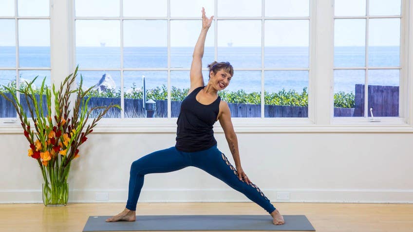 Step your left foot back and tuck your left toes under and reach through your left heel and then spin your left heel down and lift your left arm up. You're coming into a side plank variation here and you can turn the head to gaze past the hand if that's comfortable for your neck and then go ahead reach the left arm really far over the ear and open up the ribs and I'm doing a little bit of a press off the fingers here to pop the hips up and feel the opening in the side waist. From there come back into your plank pose right knee in towards your nose. Step back into plank. Bring the left knee into your nose. Down dog split, left leg up. Step right in between your hands come into your lunge and then let your back knee bend a little bit bring the arms up coming into a high lunge but I like a little bit of a bend in the back knee here and that gives the tailbone some opportunity to drop and I feel like the spine is a little bit more in alignment. From here straighten out the front leg arms are up venous mudra and then bend the left knee and again like that pressing into the feet straightening out the left leg and then let it bend. One last time like that inhale lengthen the left leg and exhale let it bend and then bring your hands down to the ground step back into plank pose. From here we're lowering knees chest and chin ashtanga namaskar and most of the weight here is on my hands. Slide through right into a little bit of a cobra and then just to work the muscles of the upper back you can slip the arms back bringing the hands back underneath the shoulders press back puppy pose and we're going to start this first one off very gentle come up onto the fingertips tip the hips up gaze out in between the hands press the tops of the feet down and let the shoulders open and the throat and then come back onto hands and knees step the right foot back tuck the right toes under and then spin the right heel down and lift up the right arm coming into your side plank variation take the right arm over your ear reach through it and send the right ribs up and there's all that space for the right lung lots of breath here bringing the right hand down plank left knee into your nose step back plank right knee into your nose down dog split right leg up stepping through come back into the lunge a little bend in the back knee arms come up venus mudra and then straightening out your right leg draw the ribs back lift the navel energy moving upward and there's even and then bend the knee and straighten out the right leg there's even energy moving upward as the knee bends right can you keep that containment of the ribs the lifting up and space in the throat one more time straightening out your right leg and then let it bend bringing the hands back down to the ground step back plank pose lower knees chest and chin slide through cobra maybe taking the hands back opening the chest lengthening the throat hands under the shoulders puppy pose and again go gentle into this one right it's a lot on the shoulders a lot on the throat so if you've got shoulder stuff going on really just soften into this one and it might be that the head drops down and it feels a little bit more like a child's pose for you and then come back onto hands and knees tuck the toes under lift the hips up up downward facing dog so in your down dog have a moment you can shake out the head here and then you might settle your eye gaze towards your feet right and that gives the mind a little bit more to focus on the senses a little bit more of a job to do to keep us present and then start to walk your feet forward coming towards the front of your mat and your knees can bend here and then once you get there a little bit of bend in the knees feet are maybe one fist distance apart here and then bring the hands up onto the shins and lengthen the spine now if you need to keep the knees bent you'll do that extend the spine forward reach the chest forward the chin forward strong exhalation fold back into the legs let the head bow again like that lengthen out the spine reach through the chest gaze it can be soft down the tip of the nose and exhale folding into the legs last time like that bring the hands up onto the shins half lift through the spine take your hands to your hips roll your shoulders back press into your feet keep the head aligned neck aligned with the spine as you come up coming to the front of your mat into dasana if you're not there already hands come back to venous mudra let the eyes close and moving into that ujjayi pranayam just to stimulate the throat a little bit further and get the powers of communication operating fully let's take one breath in together one breath out and moving into some suryanamaskar variations with the emphasis on udana vayu you can reach the arms forward lift them up keeping the venous mudra maybe a little tip back there and then soften the knees and fold your way forward utanasana standing forward bend step your right foot back into a lunge and look forward down dog with your breath out inhale out into plank pose lower your knees your chest and your chin slide through into cobra and press back downward facing dog dog lift your right leg up step it in between your hands coming up into your high lunge venous mudra and then a little bit of a push off step your left foot to meet your right your knees can soften here straighten out the legs and tip back hands come back to the throat again making a little bit of a sweep with the arms lean back and then soften the knees to fold forward send your left leg back look forward down dog with your breath out inhale out plank pose lower knees chest and chin slide through cobra and press back down dog reach the left leg up step it in between your hands back knee can soften venous mudra with the arms in your high lunge bring the right foot to meet the left straighten out the legs lift up hands come back towards the throat one more round just like that reaching up and back and exhale to fold 
