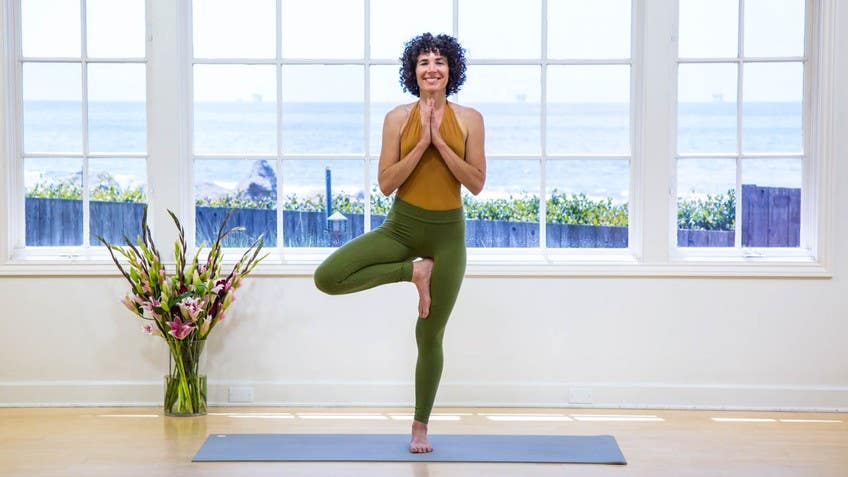 Feel into the sides of the heels and the balls of the feet. I think of this as falling up. Do I move down in order to move up? On an inhale, let your palms float out in front of you. On an exhale, turn your palms down, bend your knees and let your sitting bones come nice and low, whatever again that means for you today. Turn your palms up, inhale, come up, rooting down to rise. Exhale, turn your palms down, bend your knees, sitting bones close to the heels. Inhale, palms turn up, rooting down to rise. Exhale, palms turn down, bending knees coming down a few more times like that, rooting down to rise, and still feel up, still feel space as you head down, rooting down to rise, bending knees, creasing in hips, traveling down, rooting down to rise, and this time just release your arms down, bring your legs a little bit closer together, pausing into Dasana. In the pause, notice what you notice, what feels alive in you. Where is your attention drawn to? Shift your weight towards your right foot, and notice when you do that, where does your weight go? And for me, it often travels more towards the outer foot, and so I'm going to come back to two feet, shift my weight again and see if I can find both inner and outer foot rooting. Once I find that, then the left knee can rise up towards the chest. Really stand down through the right leg, stand down through the right foot, and look again as you root down, look for the up through the front of the spine. And now externally rotate the left leg and bring the foot up towards the inner thigh, or the space beneath the knee. So we're traveling towards Rishasana. Notice if a lot of weight has poured to the outer right hip, and draw that hip in so that you can feel a lightness coming up through the hip joint and up through the spine. And again, standing down through the right leg, through the right foot, and let me inspire a lift to the arms, Rishasana, rooting to rise, or we could say falling up. Feel your back body as much as your front body, and gently release your hands back down.